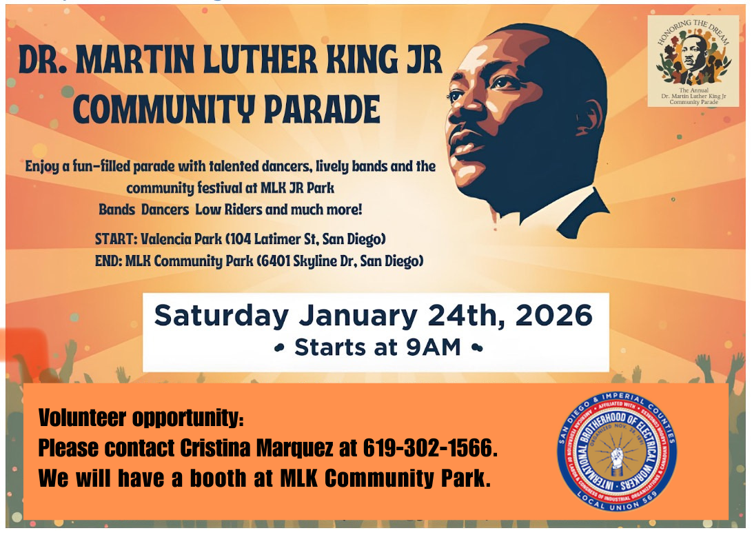IBEW 569 and our Electrical Workers Minority Caucus (EWMC) is proud to walk in the MLK Community Parade in support of civil rights and worker rights! Every year, our members march to honor the memory of Martin Luther King Jr. On Saturday, January 24, 2026, EWMC and IBEW 569 of San Diego, will celebrate one of the most prominent civil rights leaders by participating in the Martin Luther King Jr. Community Parade.