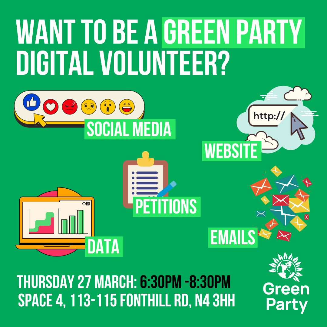 Interested in being a Green Party digital volunteer? We'll be meeting on Thursday 27th March from 6:30-8:30pm at Space 4, 113-115 Fonthill Road, N4 3HH to discuss all things digital - including social media, our website, online petitions, email handling and data entry.