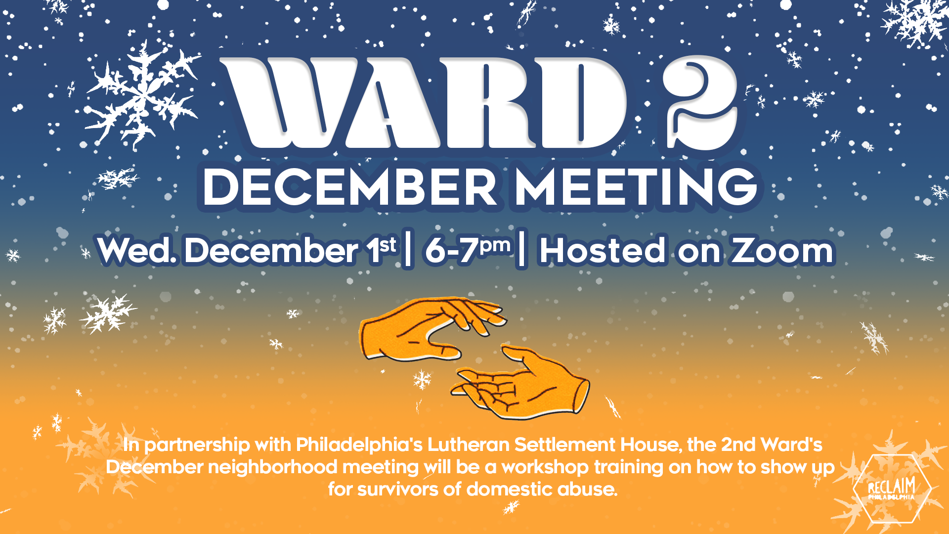 In partnership with Philadelphia's Lutheran Settlement House, the 2nd Ward's December neighborhood meeting will be a workshop training on how to show up for survivors of domestic abuse. In this training we'll learn concrete skills to support the victims of domestic violence in our lives. We will leave with a clear picture of how to support someone, and what the resources are here in Philadelphia. This will be a very special event and we hope you can join us on Zoom. Feel free to invite friends and family who you think might be interested in this workshop. All are welcome.