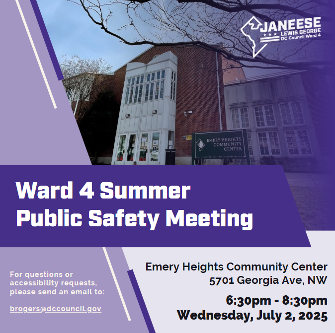 On Wednesday, July 2nd from 6:30pm-8:30pm, Councilmember Janeese Lewis George, Chief of Police Smith, and 4th District MPD Commander Lavenhouse will host a Ward 4 Summer Strategic Safety Meeting at Emery Heights Community Center (57021 Georgia Ave NW). We will discuss specific actions to address crime and gun violence and share opportunities for neighbors to support these important efforts. Please RSVP if you plan to attend. For any questions or requests for accommodations, please reach out to Barbara Rogers (brogers@dccouncil.gov).