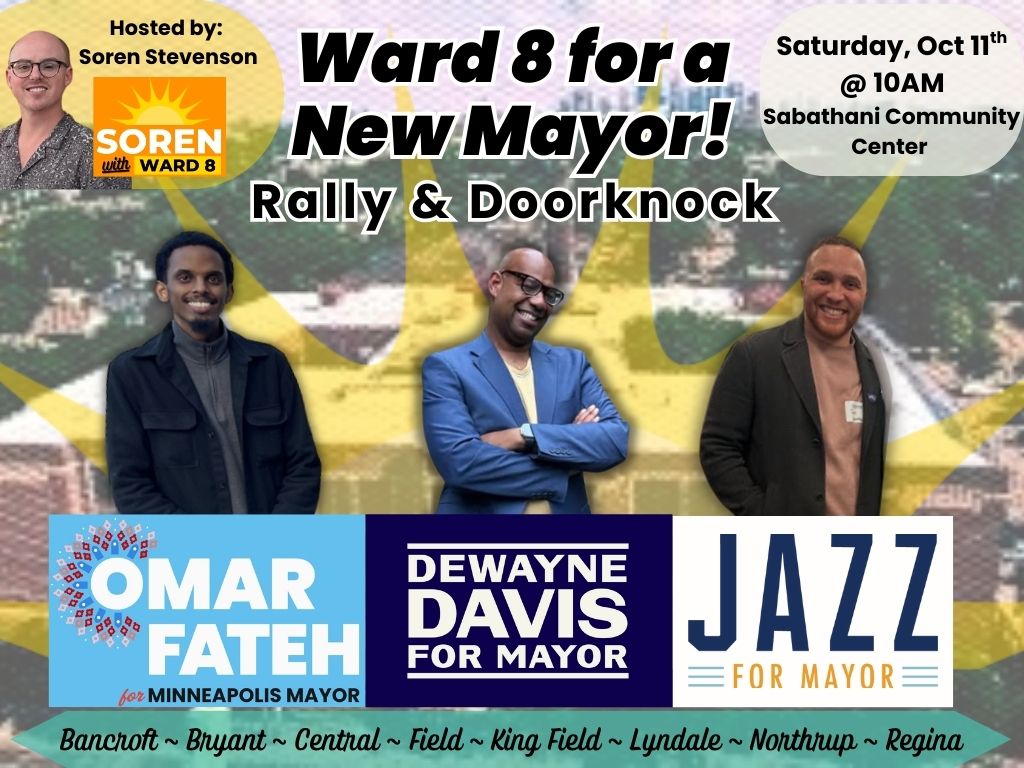 Join Ward 8 City Council candidate Soren Stevenson, and Mayoral candidates Senator Omar Fateh, DeWayne Davis, and Jazz Hampton for a rally at Sabathani Community Center. We'll hear from all four candidates as they talk about what is at stake in this election and what we need to do to win