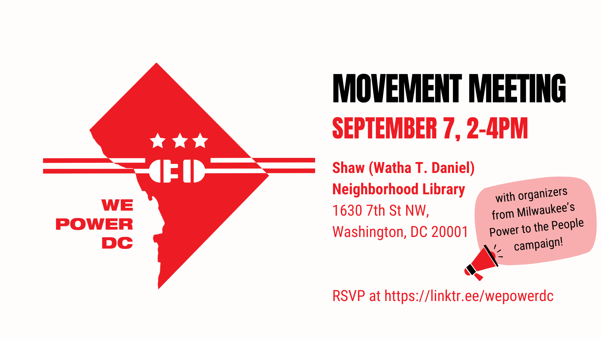 We Power DC organizers will give an overview of the campaign and some recent updates on what we've been up to. And we'll be joined by organizers from Milwaukee's Power to the People campaign fighting for public power in their city! We'll chat public power pledges, door-to-door canvassing, and legislative strategy to learn from their campaign and share our own lessons from the District.