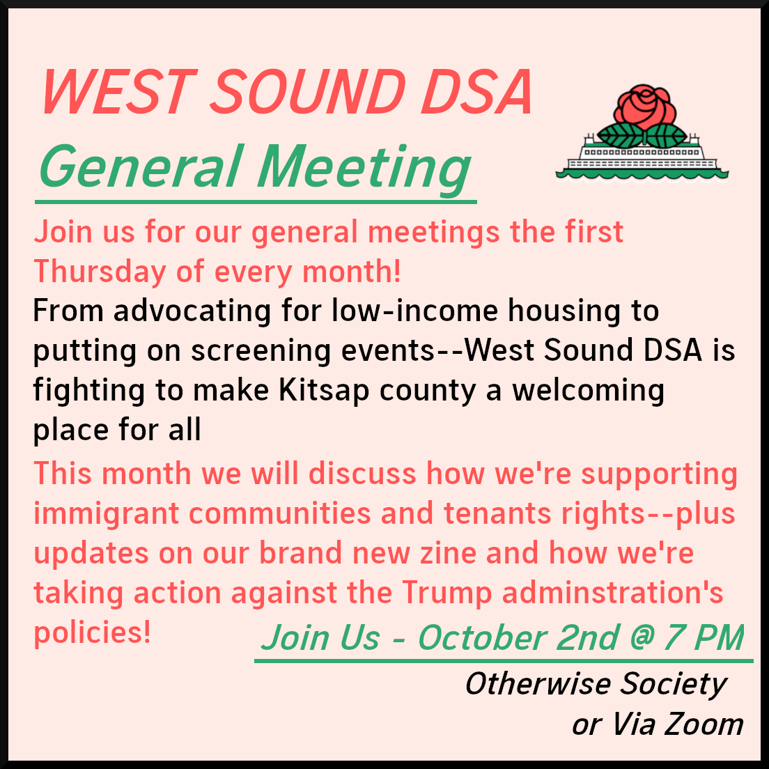 Come see what West Sound DSA is doing for the Kitsap community-- Experience our general meetings the first Thursday of every month and see how you can get involved!