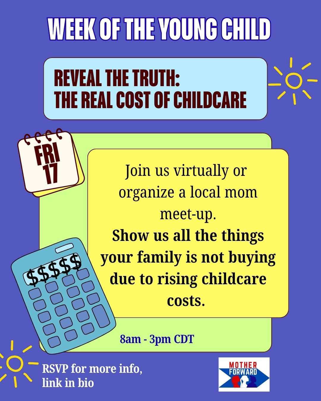 Grab a couple of moms, meet at a playground, bring a poster and some markers, and write down what childcare is costing you. Take a photo. Invite another mom nearby to add hers.