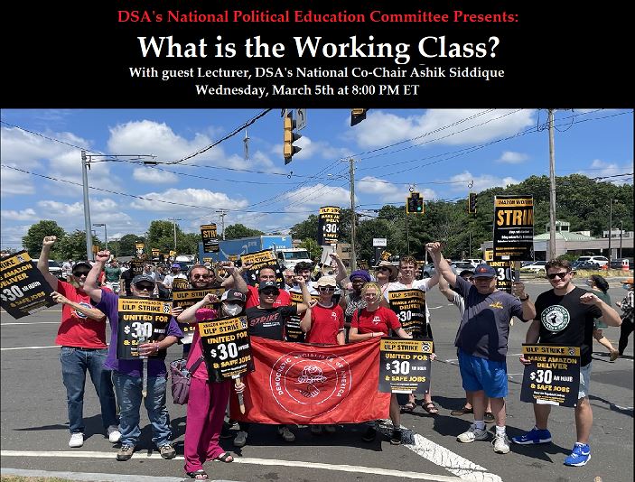 On Wednesday, March 5th at 8:00 PM DSA's National Political Committee Co-Chair, Ashik Siddique, will talk about class. Why do socialists see the working class as the central agent for social change? Who exactly belongs to the working class? Can workers still change the world today? And what is the relationship between workplace and electoral struggle?