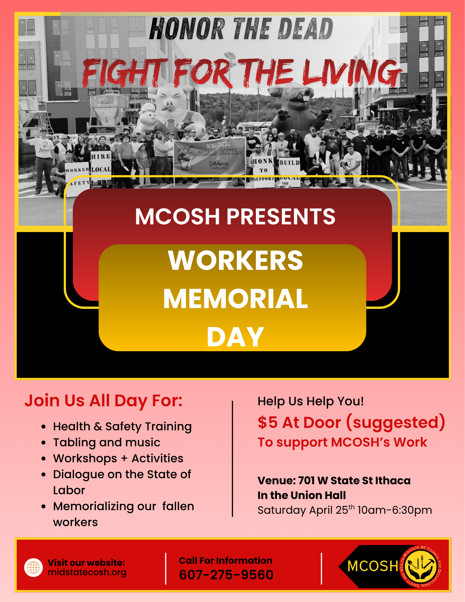 Honor the Dead, Fight for the Living! This April, the Midstate Council of Occupational Safety and Health (MCOSH) will be hosting Workers Memorial Day in Ithaca. This event is an opportunity for us to come together as a community to honor those we have lost and support families who were never able to say goodbye.