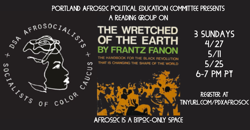 Portland DSA AfroSoC's Political Education Committee presents a reading group of Frantz Fanon's work "The Wretched of the Earth", happening every other Sunday at 6pm, starting April 27th.