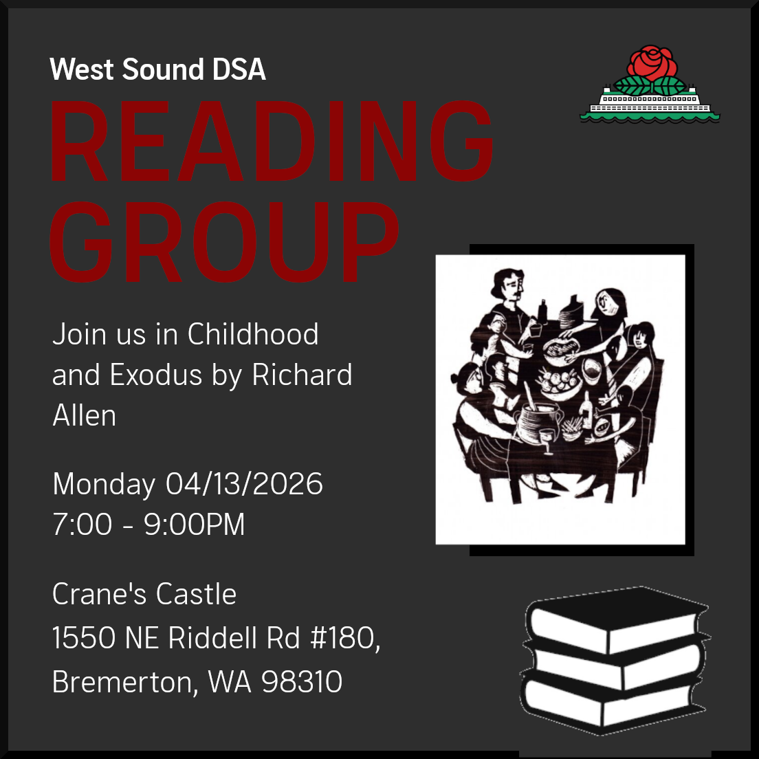 Join West Sound DSA for our weekly reading group! Whether it's critiques of an article or simply a time to talk to like-minded individuals, we would love to see anyone and everyone there! We meet at Crane's Castle every Monday at 7 PM.