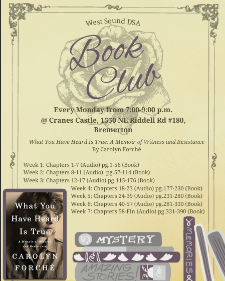Join West Sound DSA for our weekly reading group! Whether it's critiques of an article or simply a time to talk to like-minded individuals, we would love to see anyone and everyone there! We meet at Crane's Castle every Monday at 7 PM.