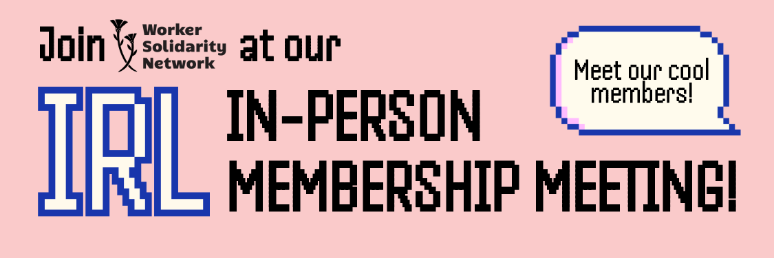 Help build WSN at the grassroots and join us for important discussions in advancing workers rights in our communities! We're moving away from gathering in online spaces and won't be having our Worker Wednesdays every month. Instead, we want to connect in person where we will share updates about where the organization is at, take various workshops to collectively build our knowledge and worker power and create space for our Members, Street Teams and Committee Members to have a say about how the work of our organization moves forward!