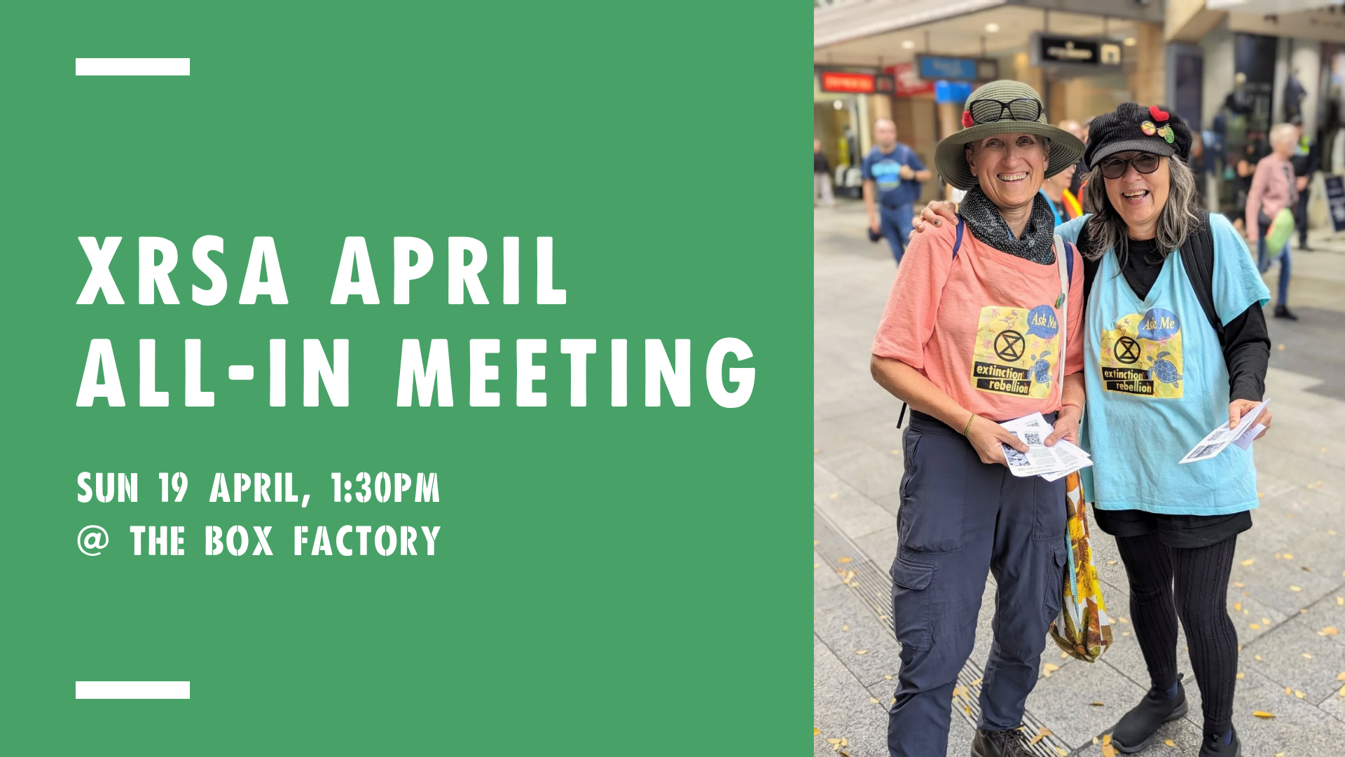 Join us for the April All-In Meeting of Extinction Rebellion South Australia - where likeminded, big-hearted community members come together to turn climate anxiety into powerful climate action!