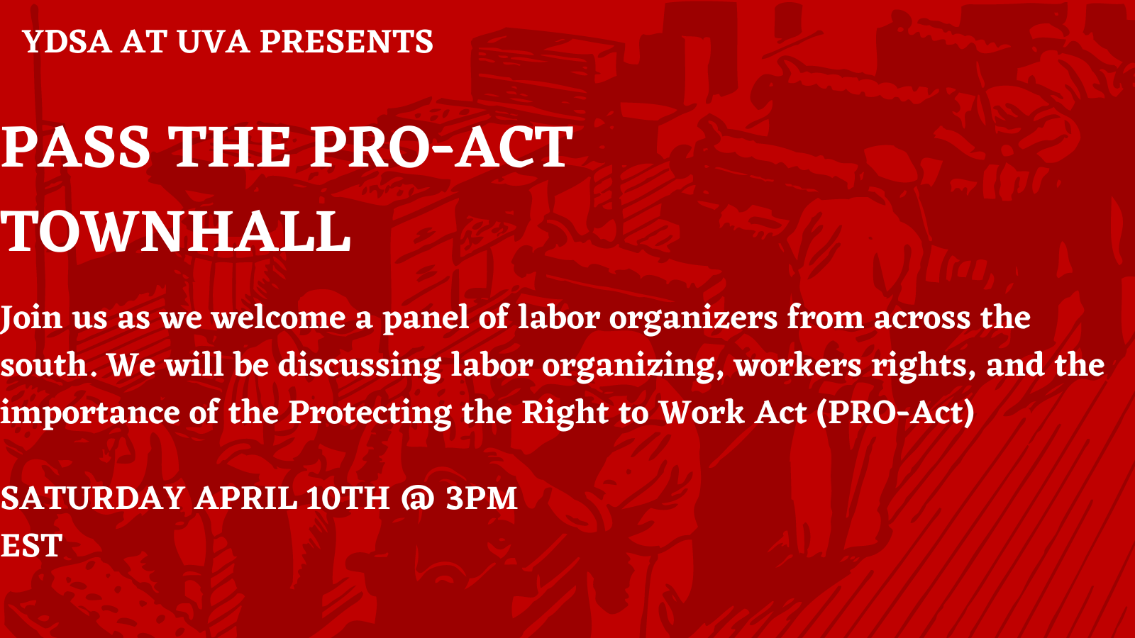 Join YDSA at UVA for a panel about labor organizing in the South. We'll be discussing public and private sector employees and how the ongoing fight for the PRO-Act can transform worker's power in this state.