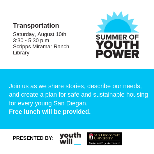We'll be meeting on August 10th, 3:30-5:30 at the Scripps Miramar Ranch Library. Can you commit to helping create a vision for a San Diego transit system that works for youth?