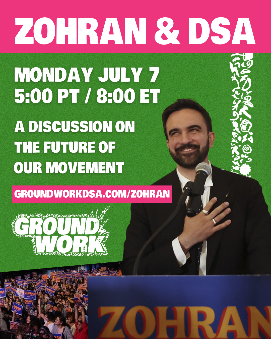 Join Groundwork and friends to debrief the Zohran campaign and discuss what this win means for the future of our movement. We'll speak with comrades from NYC-DSA, Zohran's mayoral campaign, and DSA's National Political Committee.