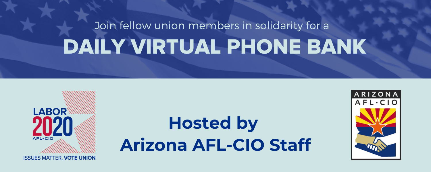 We will be kicking things off at 5:30 PM on Zoom with a virtual Labor 2020 Phone Bank Training, hosted by our Arizona Labor 2020 Campaign Team! We'll walk you through what our Labor 2020 Campaign plan is, how our phone bank system works, and how we plan to get pro-labor candidates elected by talking to our Union Brothers & Sisters.