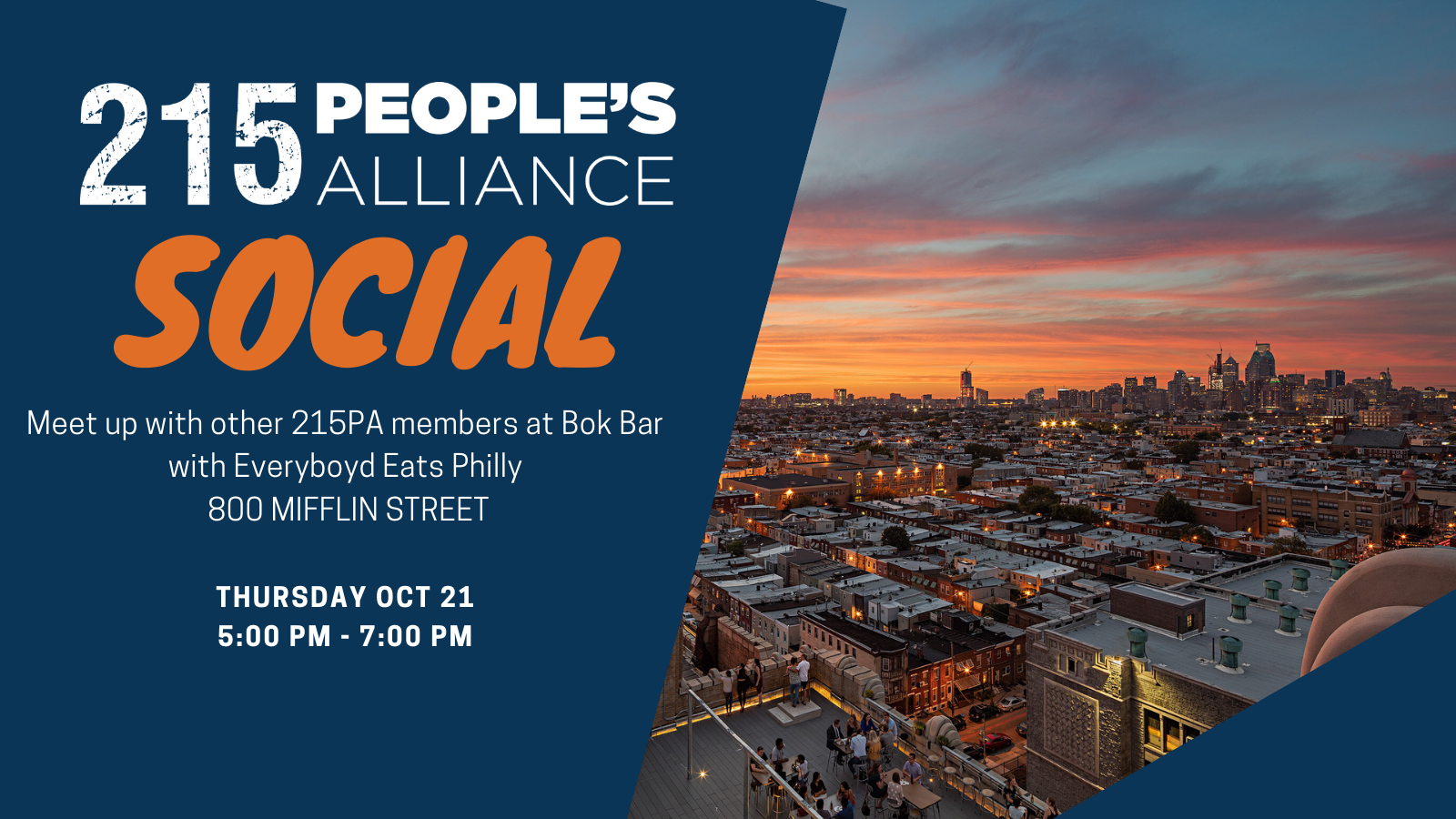 Join us at Bok Bar, 800 Mifflin St., to meet up with other 215PA members and hear about our work as we build our community.