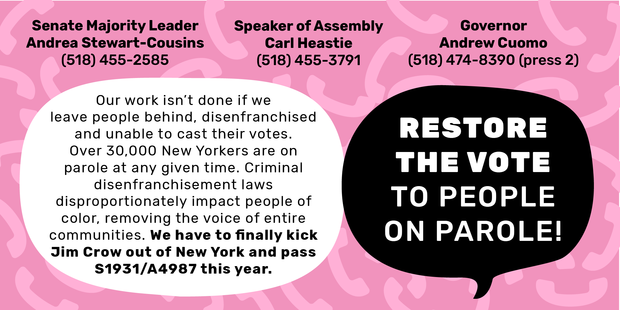 Call your the state leaders today and tell them that we need them to pass S1931/A4987, restoring voting rights to people on parole, before the end of session.