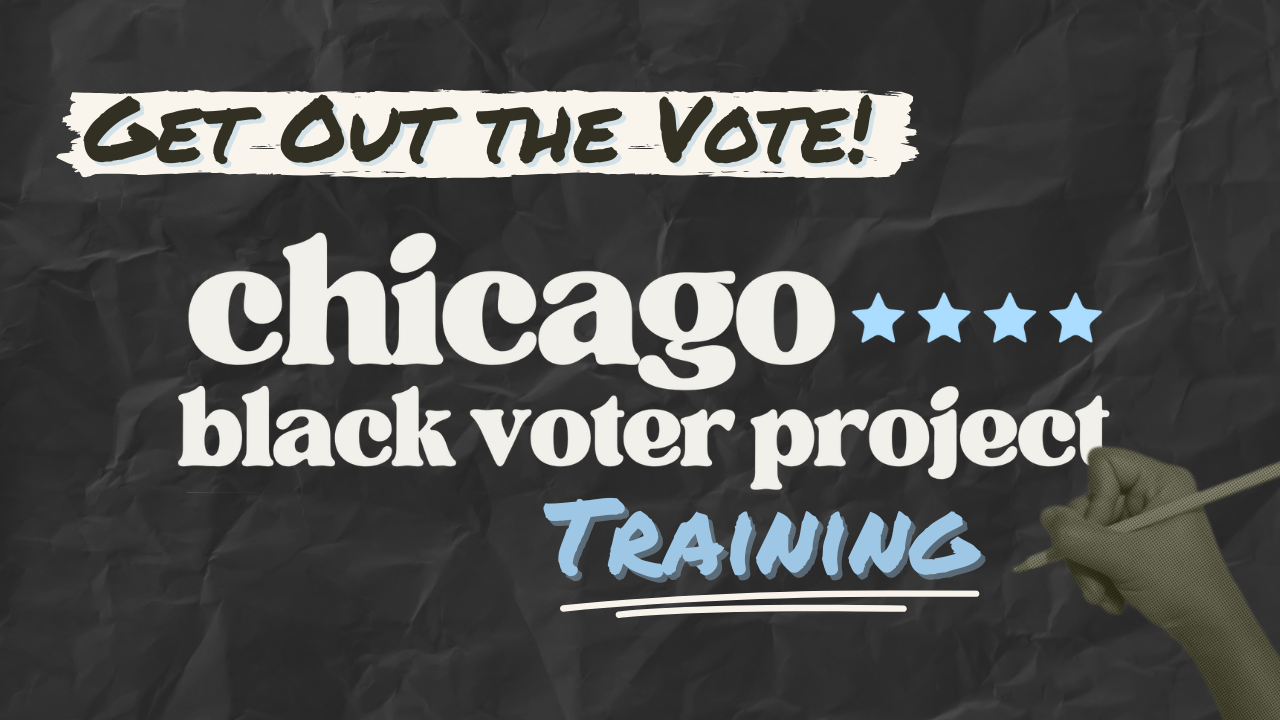 Join the Chicago Black Voter Project on Sunday, March 1st from 1-4pm for a Get Out the Vote Training where you will learn how to mobilize your community so we can leverage Black Political Power at the ballot box. Become a leader and sign up today! (Location is TBD)