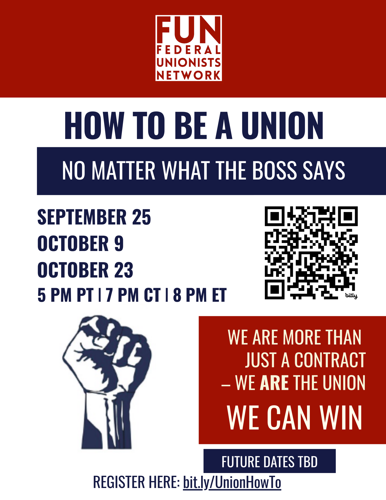 The Trump administration thinks canceling contracts will break us—but we are more than a contract. We are the union. Our power comes from collective action, staying connected, and defending the public good. Join FUN’s training at 8:00 pm Eastern every other Thursday night to learn how to organize, protect your rights, and take action without a contract.