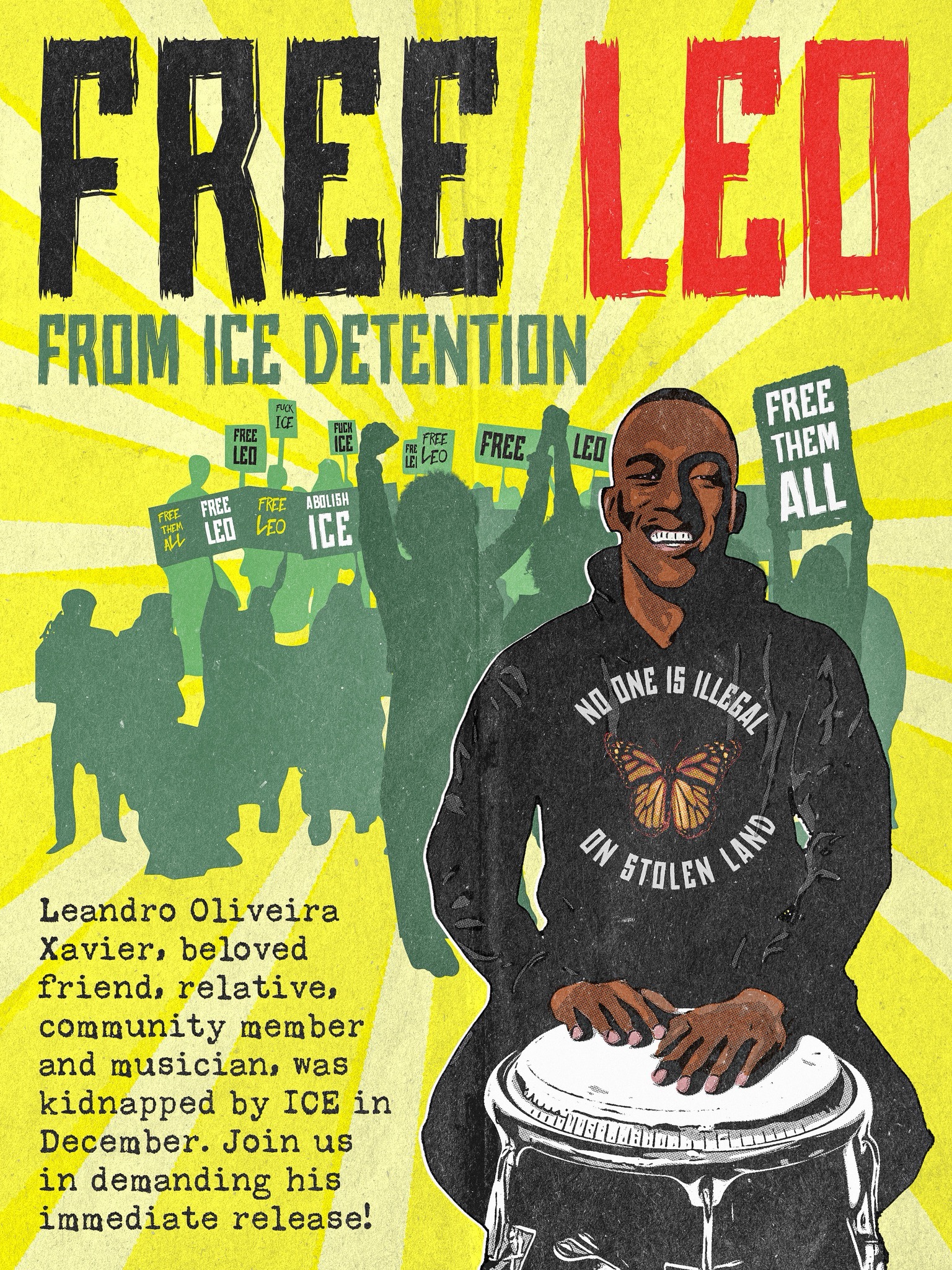 Through Audiopharmacy and Namorados Da Lua, his art harnesses the history of the African diaspora, Indigenous resistance, and international solidarity—sustaining prominent ties to international and global liberation movements. Incarcerating someone like Leo is no accident; it is part of a system that targets immigrant communities through violence, family separations, and the militarization of ICE.