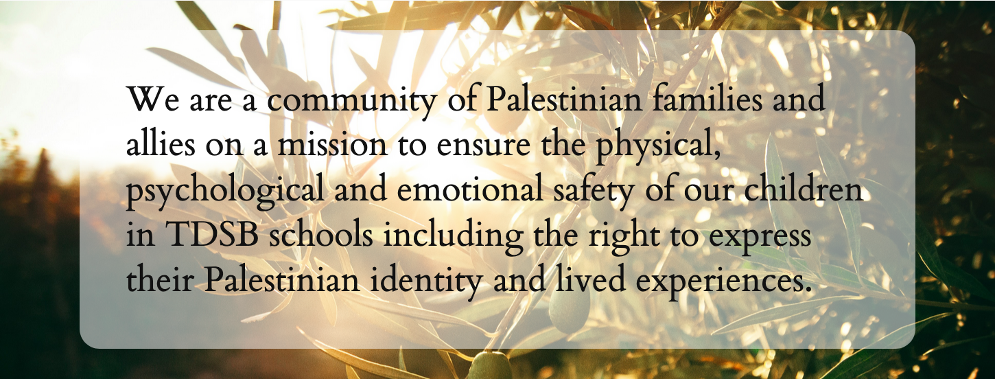 We are a grassroots group led by Palestinian families advocating for safe and inclusive spaces free from anti-Palestinian racism and other forms of inequity in the TDSB