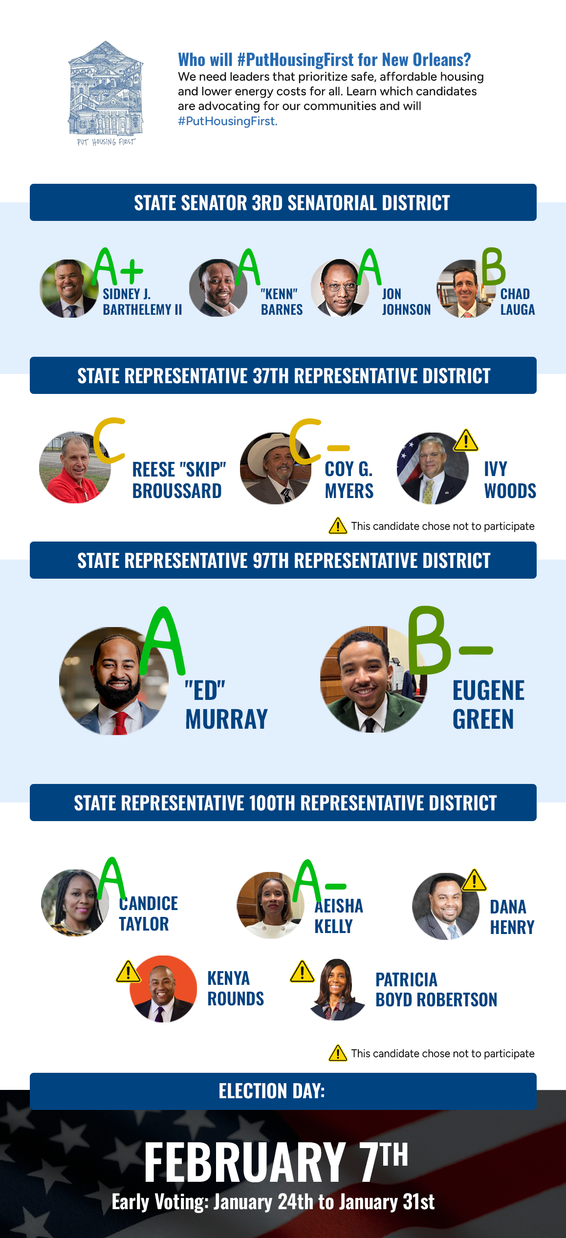 While the Greater New Orleans Housing Alliance does not officially endorse any political candidates, GNOHA releases the #PutHousingFirst Candidate Scorecard as an indicator of a candidate’s concern, or lack thereof, regarding affordable housing. We encourage voters to consider the #PutHousingFirst scorecard as they participate in early voting and go to the polls on Election Day.