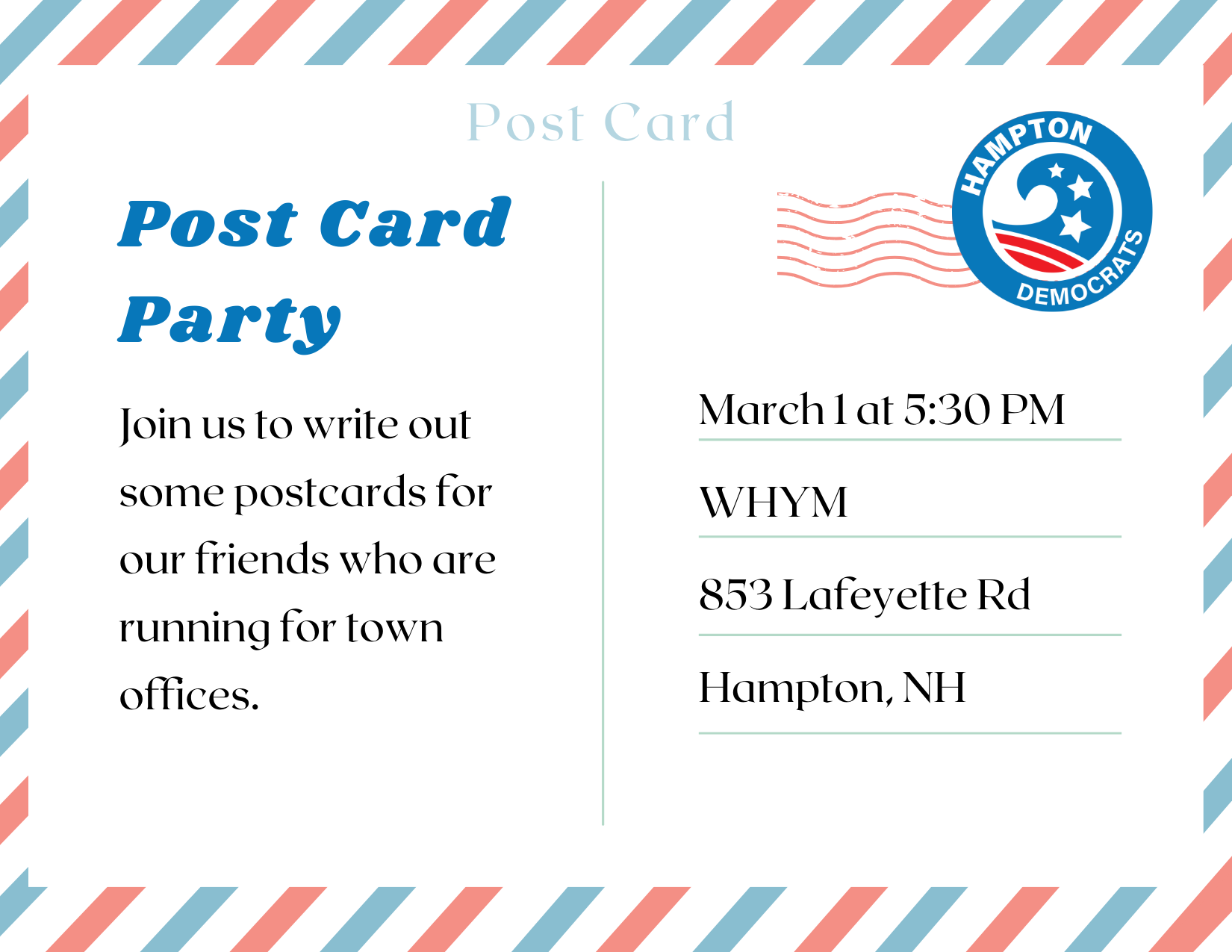 Join us on Friday, March 1, at 5:30 pm to write out some postcards for our friends who are running for town offices.