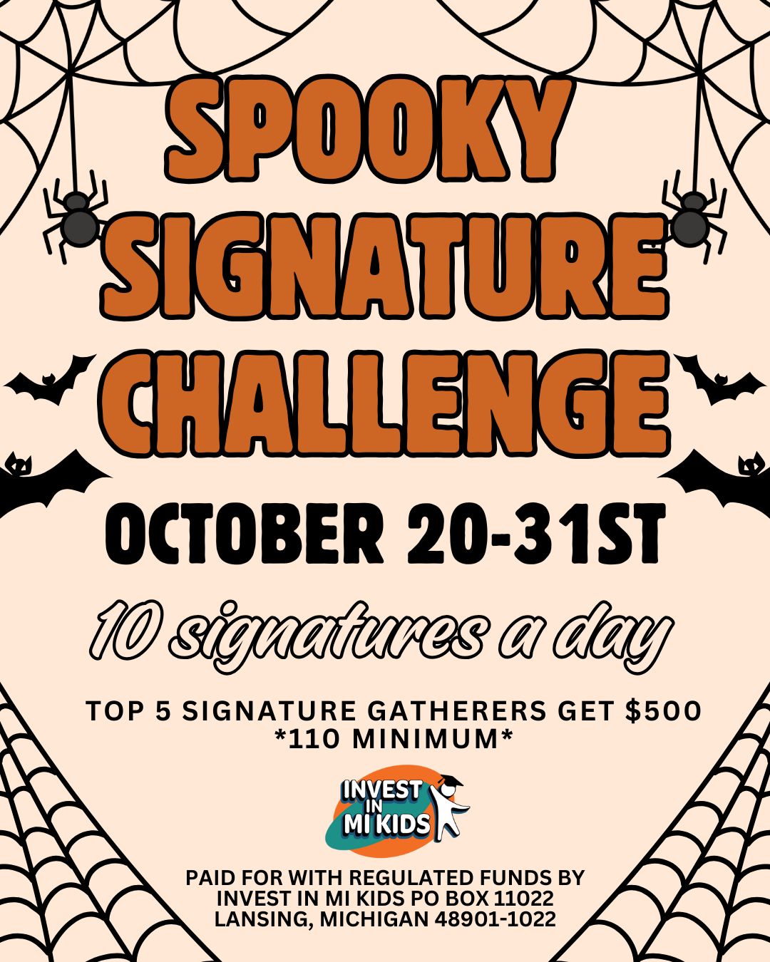 Hi Invest in MI Kids team! We need to ramp up our number of signatures ASAP, and so we want to take advantage of the fun fall activities happening these next few weeks.