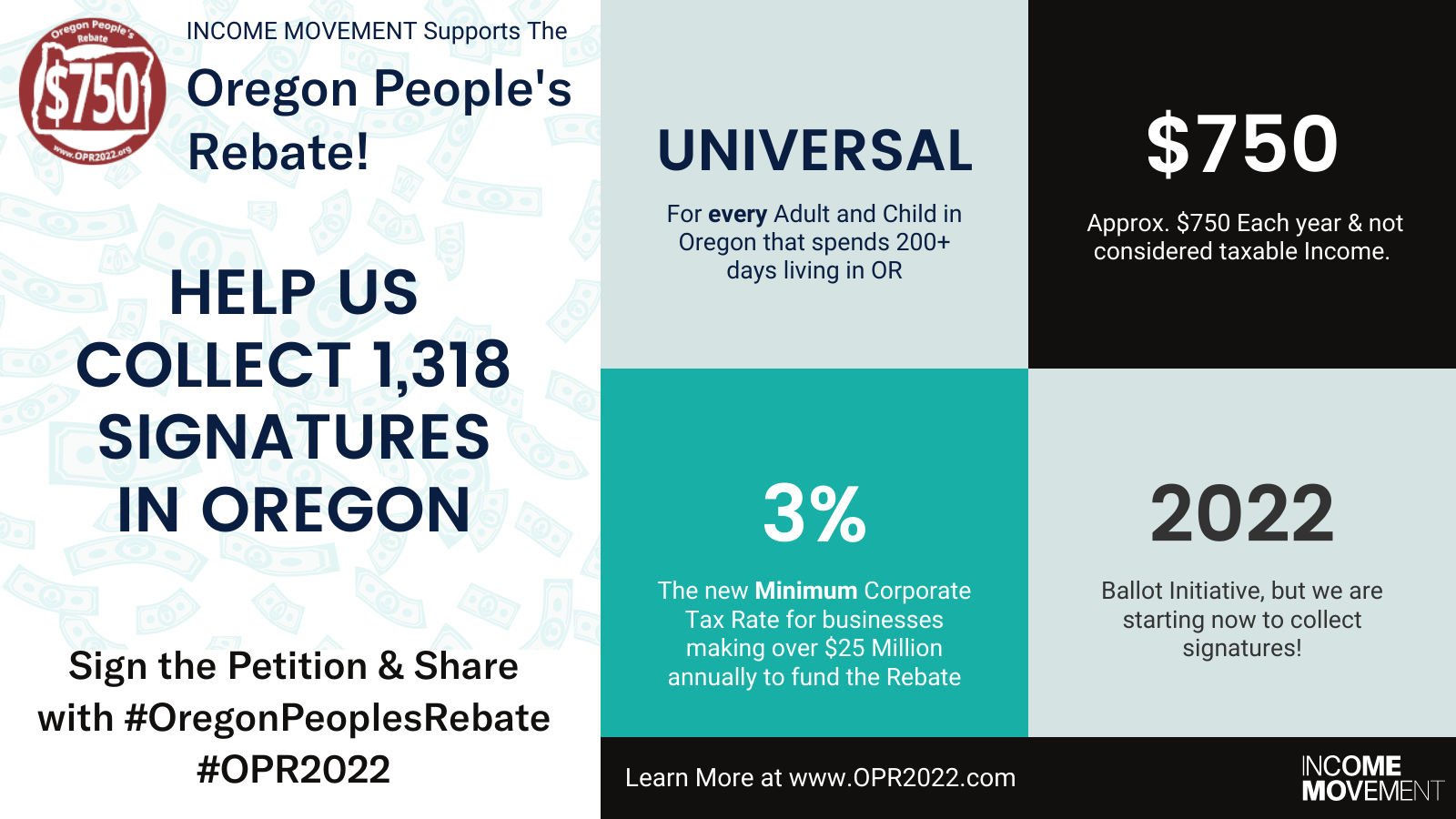Income Movement is excited to support the Oregon People's Rebate, a 2022 ballot initiative that would bring an about $750 rebate to every Oregonian each year. By bringing the minimum Corporate Tax Rate for Businesses making over $25 Million from .18% to 3%, it will take that money and return it back to the people of Oregon.