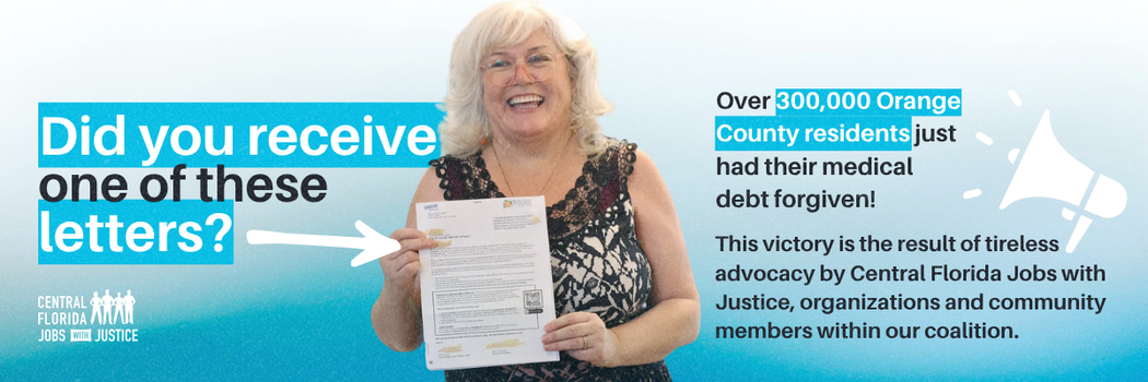 Last year, Central Florida Jobs with Justice joined forces with faith leaders, healthcare advocates, and residents carrying the weight of medical debt to deliver a clear demand to Orange County Commissioners: use pandemic relief funds to cancel medical debt. We shared stories of families drained by impossible choices: rent or prescriptions, groceries or hospital bills. We pushed commissioners to partner with Undue Medical Debt, transforming $4.5 million in public funds into nearly half a billion dollars in relief. We rallied outside government buildings, held press conferences, and refused to let decision-makers look away.