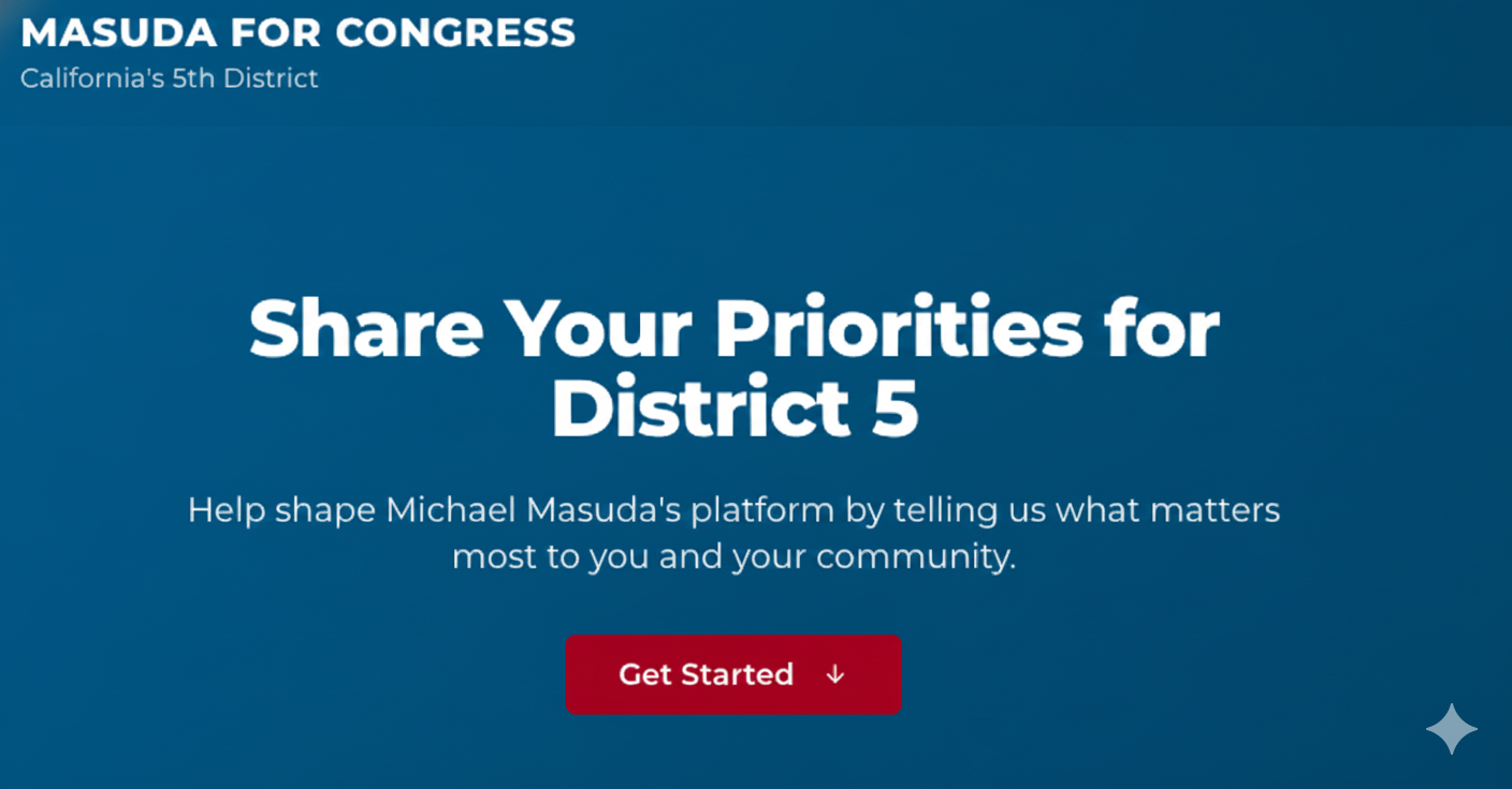Michael Masuda is conducting a listening tour across District 5. Share what matters most to you - from Modesto to Mariposa, Turlock to Tuolumne. Your input will help shape a platform built on common ground. This takes 2-3 minutes. Vote on statements others have shared, then add your own priorities.