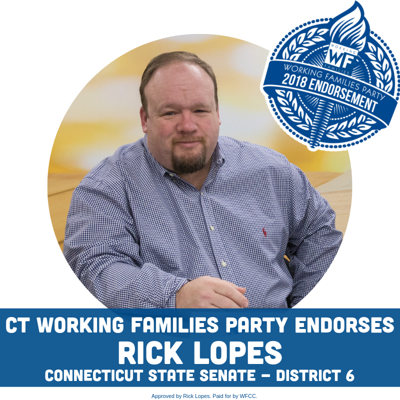 Support Rick Lopes for State Senate on the Working Families Party line in the 6th State Senate District, including Berlin, Farmington, and New Britain! The special election is on February 26th.