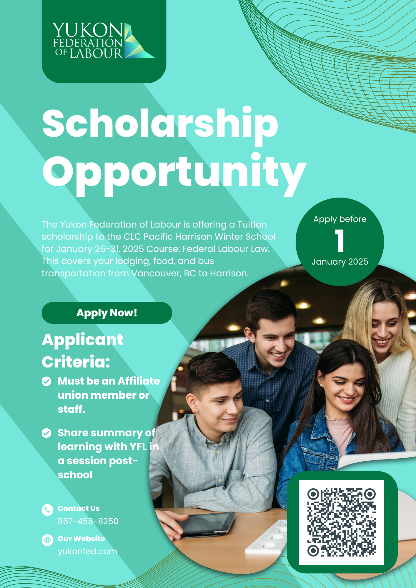 The Yukon Federation of Labour is offering a Scholarship for one student to the CLC Pacific Harrison Winter School for the week of January 26-31, 2025 to the Course: Federal Labour Law. This scholarship covers your tuition, accommodation, food and bus transportation from Vancouver to Harrison, BC (value of $2305.00).