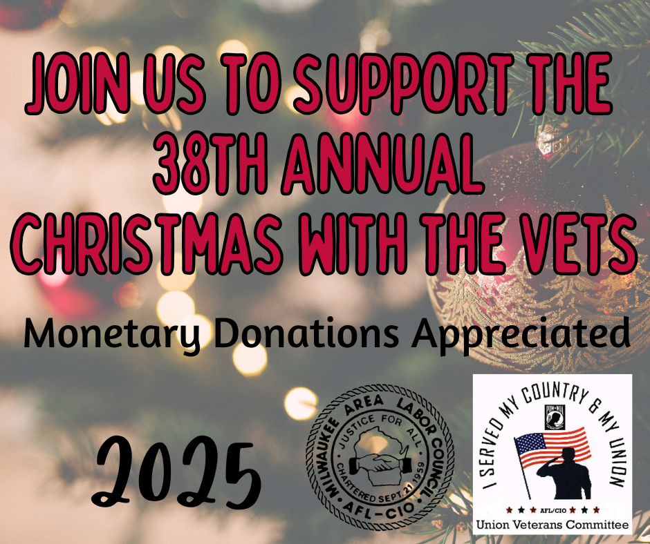 On behalf of those who sacrificed so much for our country we ask you to please consider donating to “Christmas with the Vets” through a gift from your local treasury and/or from individual members. Please make checks payable to Labor Community@Work and write “Christmas with the Vets” on the memo line. All donations appreciated by Friday, December 12, 2025.