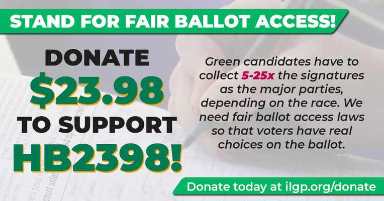 The fight for Equal Ballot Access in Illinois is hard! House Bill 2398 did not make it very for but we will continue to fight for equal ballot access! For more information on HB2398, view the ILGP issue statement at: ILGP Issue Statement on Equal Ballot Access