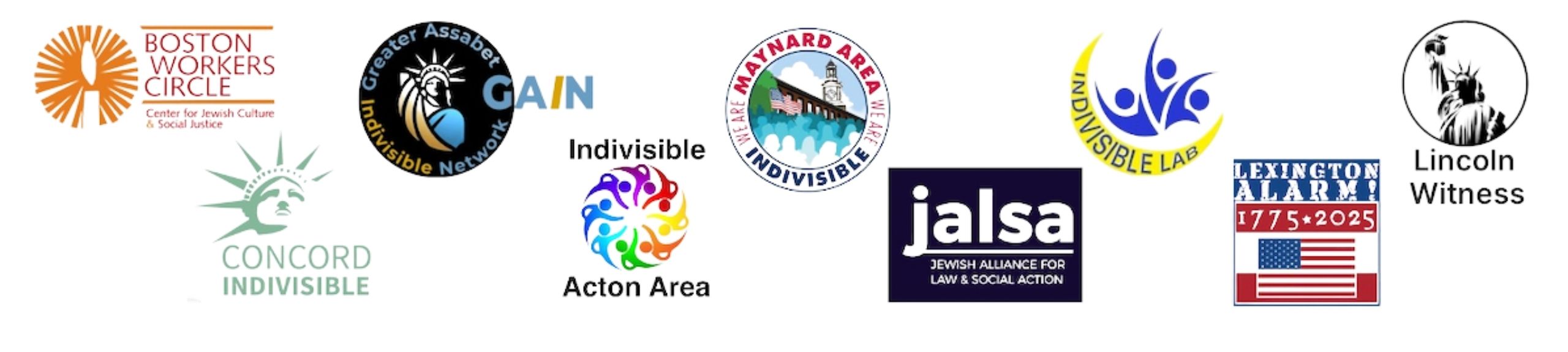 Coalition groups include Boston Workers Circle, Concord Indivisible, Greater Assabet Indivisible Network (GAIN), Indivisible Acton Area, Indivisible Lab, Indivisible Maynard Area, Jewish Alliance for Law & Social Action (JALSA), Lexington Alarm, and Lincoln Witness.