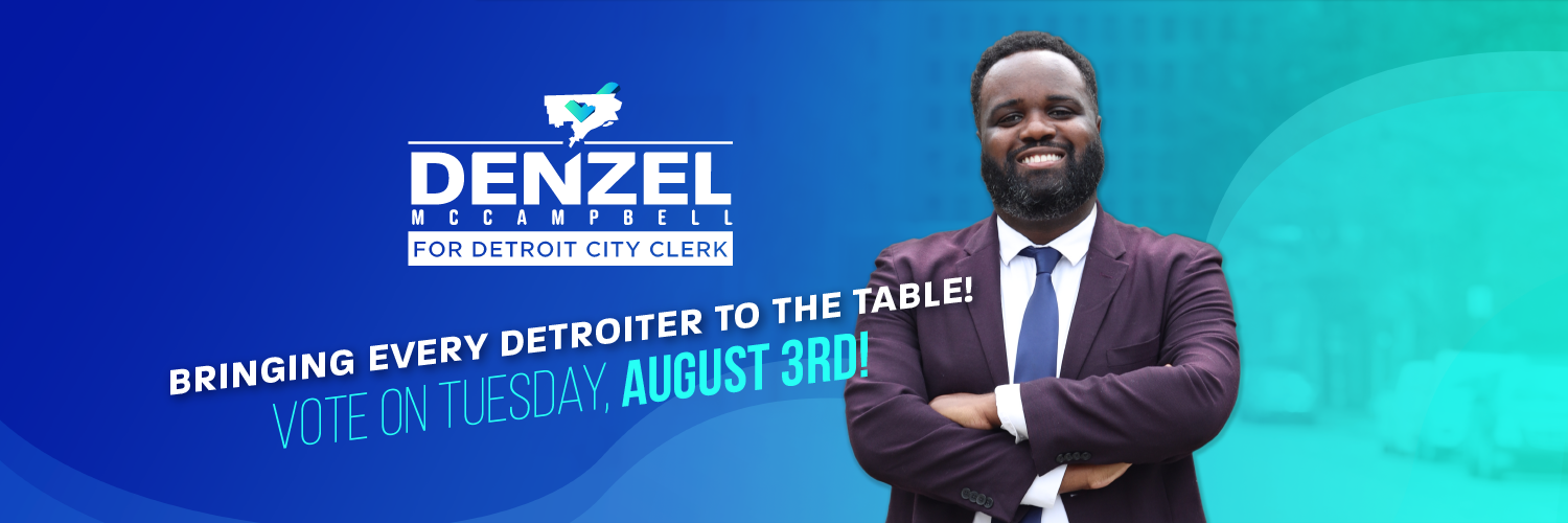 Denzel McCampbell is a grassroots activist and election protection organizer running for Detroit City Clerk. Denzel is running to increase access to the ballot box, fight back against voting rights attacks, and make the Detroit City Clerk's office the center of civic engagement for Detroiters. Denzel is fighting to ensure that every Detroiter is at the table when it comes to our government.