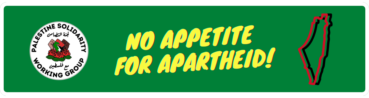 The No Appetite for Apartheid Campaign is a national campaign to create Apartheid-Free Zones in local businesses throughout the nation. This campaign builds solidarity and accountability using BDS (Boycott Divestment and Sanctions) tactics. We aim to spread the mentality of BDS to consumers, workers and store owners.