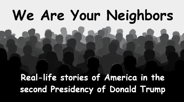 Millions of Americans have had their lives wrecked or up-ended by the actions of the Trump regime. In every area of the country (coastal, heartland, urban, rural, red, blue, purple), people have been fired, demoted, defunded, deported, disappeared, or hammered in the pocketbook. “We are your neighbors” is an effort to gather and share these stories – as many as possible, as widely as possible.