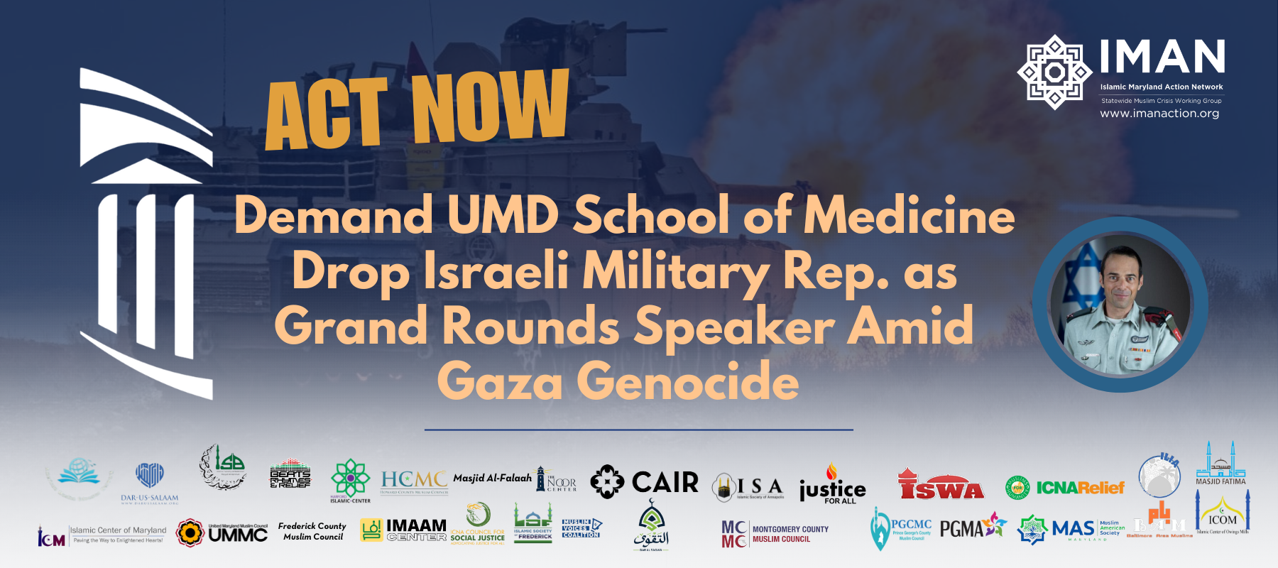 TAKE ACTION. Join the IMAN Network in calling on UMDSOM leadership to reverse this decision and drop this speaker. It is an affront to the principles of medical ethics, human rights, and the sanctity of healthcare spaces. Email and let them know that inviting a representative of the IDF—a military body representing a government actively engaged in genocide and responsible for grave atrocities against civilians and medical professionals—contradicts the mission of saving lives and advancing care, and they should rescind this invitation immediately.