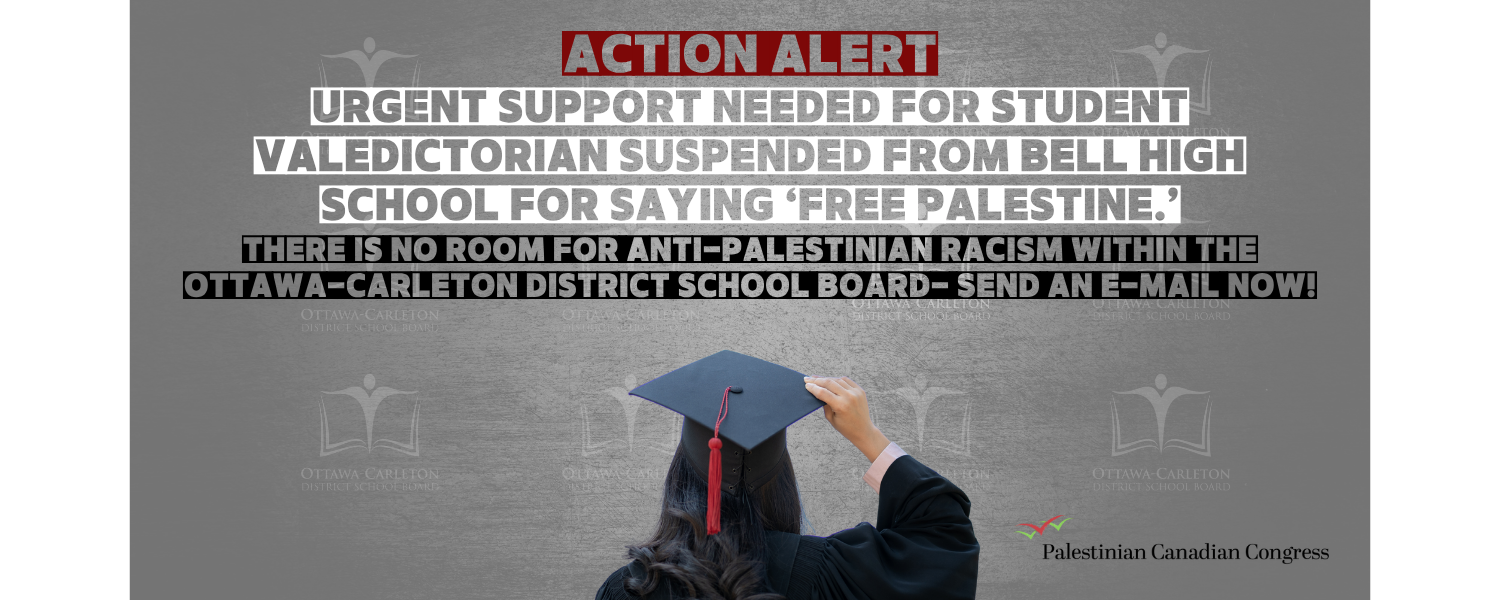 This response to the valedictorian’s speech is outrageous and directly violates multiple OCDSB policies. Specifically, the OCDSB’s stated policy which permits the use of the phrase “Free Palestine”. It is also a direct violation of the OCDSB’s Equity Policy on Recognizing Anti-Palestinian Racism which clearly states that “stopping or preventing conversations about Palestine because they are ‘controversial’” and “surveillance, over-policing or censoring of Palestinian expression” as examples of Anti-Palestinian Racism.