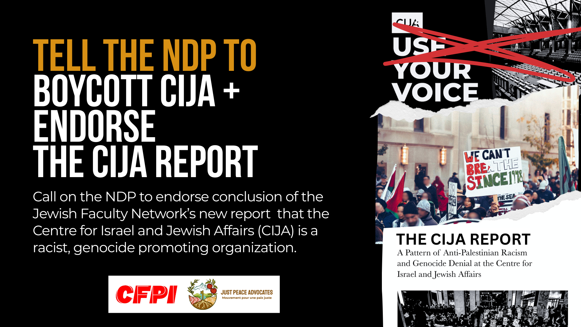Call on the NDP to endorse the conclusion of a new report and boycott the Centre for Israel and Jewish Affairs. A Jewish Faculty Network report correctly concludes that CIJA is a racist, genocide, promoting organization.
