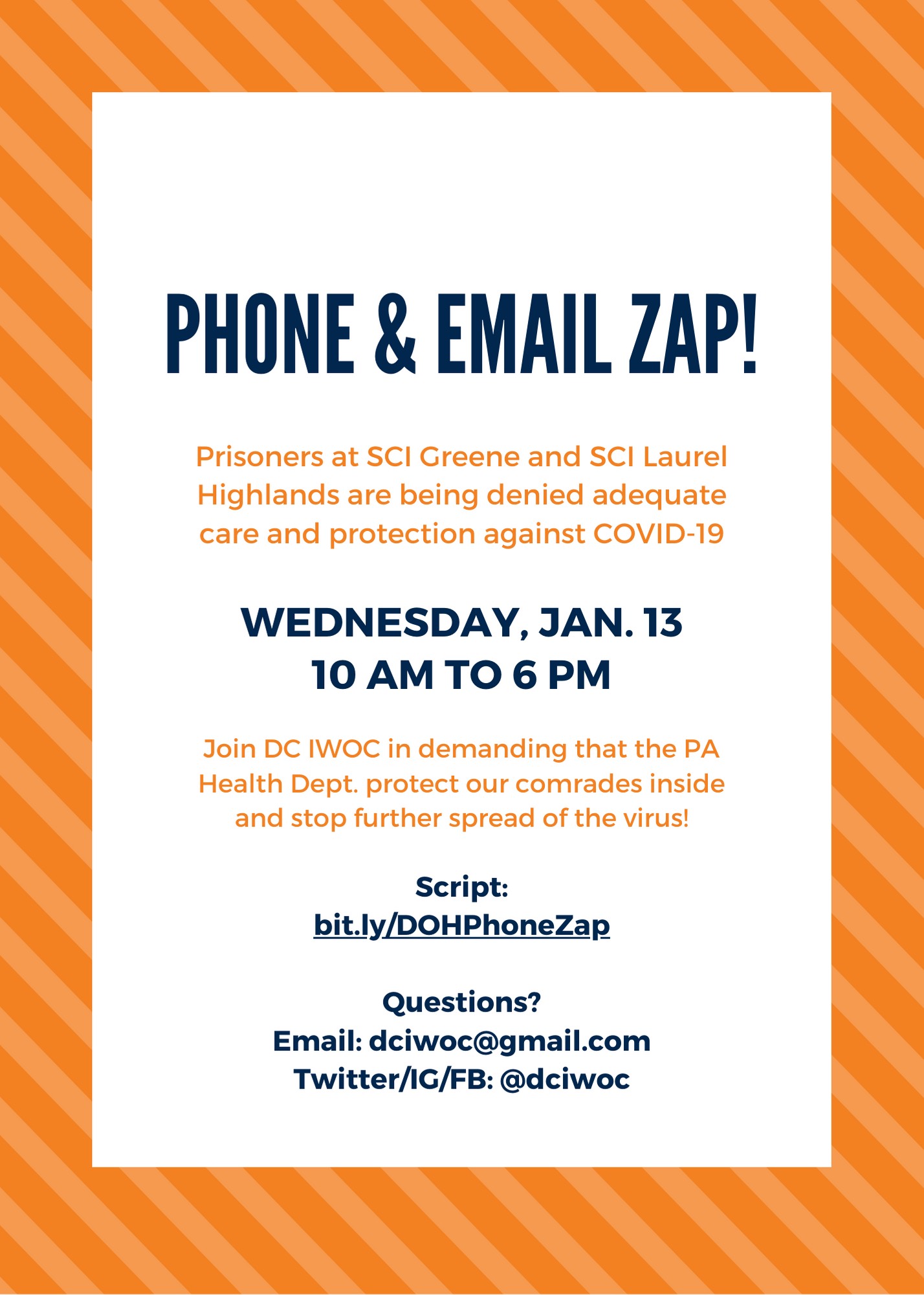 The Pennsylvania Dept. of Corrections (PA DOC) is subjecting people caged at SCI Greene and SCI Laurel Highlands to inhumane conditions during a global pandemic. PA DOC facilities like SCI Greene and SCI Laurel Highlands are experiencing a COVID-19 outbreak throughout the entire prisons because these prisons are incapable of adhering to the CDC’s guidelines to limit the transmission of the coronavirus. For months, prisoners have been forced to use the same phone and kiosks without sanitation measures taken, handcuffs are not disinfected between uses, they are only allowed to clean their cells once a week with watered down solutions, and the limited supplies issued for cleaning are never sanitized. Furthermore staff routinely mock those incarcerated at SCI Greene taunting, “Medical is a joke. You’ll die fucking with these nurses.” These kinds of comments discourage people from reporting illness to staff, who clearly cannot be entrusted with the care of incarcerated people. To date, SCI Greene has had 117 positive cases and SCI Laurel Highlands has had 488 cases. Both prisons are doing little to stop the spread. Social distancing is impossible behind bars. Rise up, fight back in solidarity with our comrades behind bars. The demands are as follows: