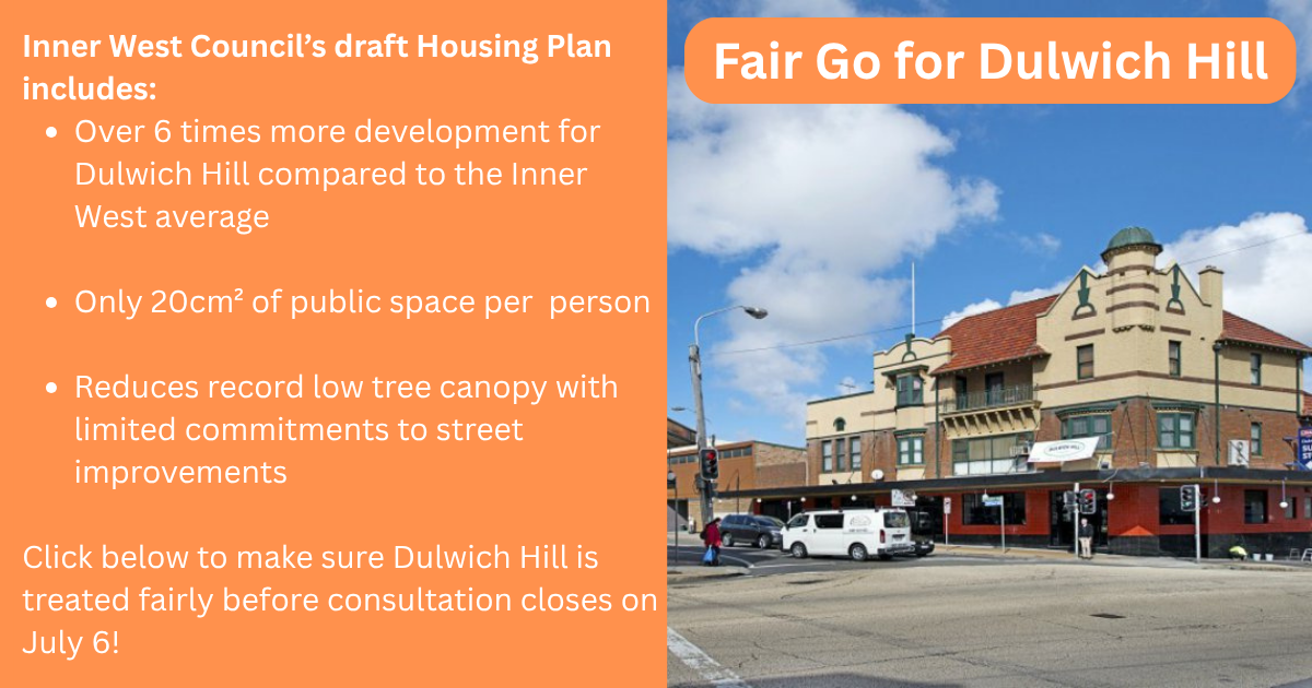Inner West Council has released a draft development plan for consultation called Fairer Future for the Inner West. The plan unfairly targets Dulwich Hill for a huge proportion of the increased density - without providing the investment to support it. This includes: