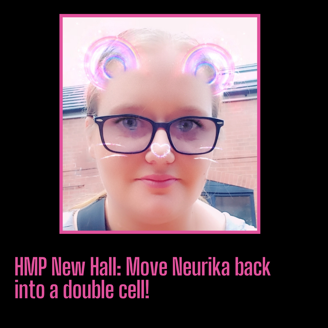 Neurika is "risk assessed" to be able to share but remains isolated. Instead of support Neurika has been adjudicated for "refusing to move into a safe cell". A coerced move in the name of "safety"Not long ago you uplifted Neurika’s demands and got her into a shared cell. Please let's do so again!