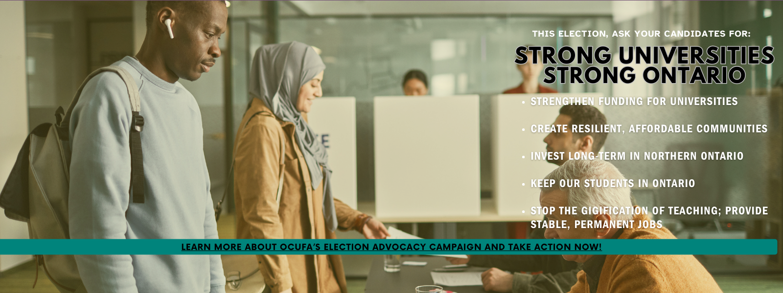 Send an email to four Ontario election leadership candidates asking them to show their support for strong sectoral funding, long-term investments for Northern universities, removing barriers to domestic student enrolment, fairness for contract faculty, and increased student aid at all Ontario’s universities.