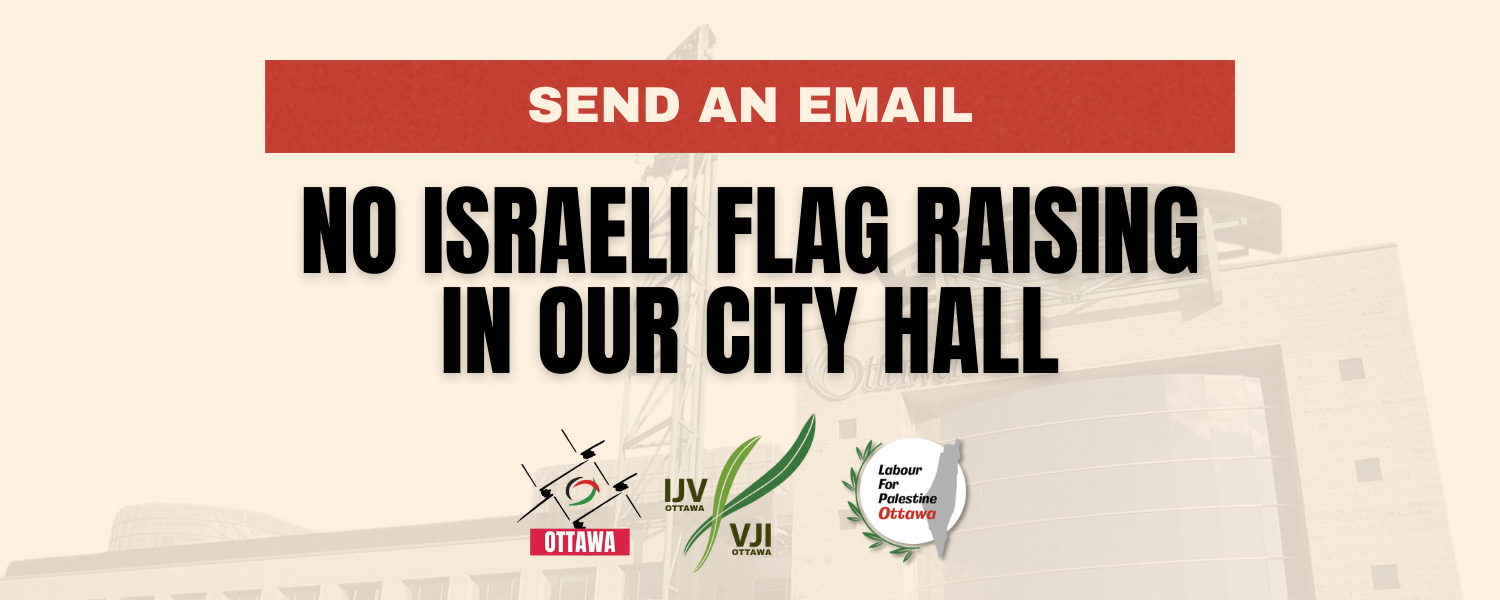 The City of Ottawa is, once again, planning to raise the Israeli flag this May. At last year’s event, which took place in spite of concerns raised by residents, a member of our community was physically assaulted for protesting a genocide, and charges were subsequently dropped despite video evidence of the attack.