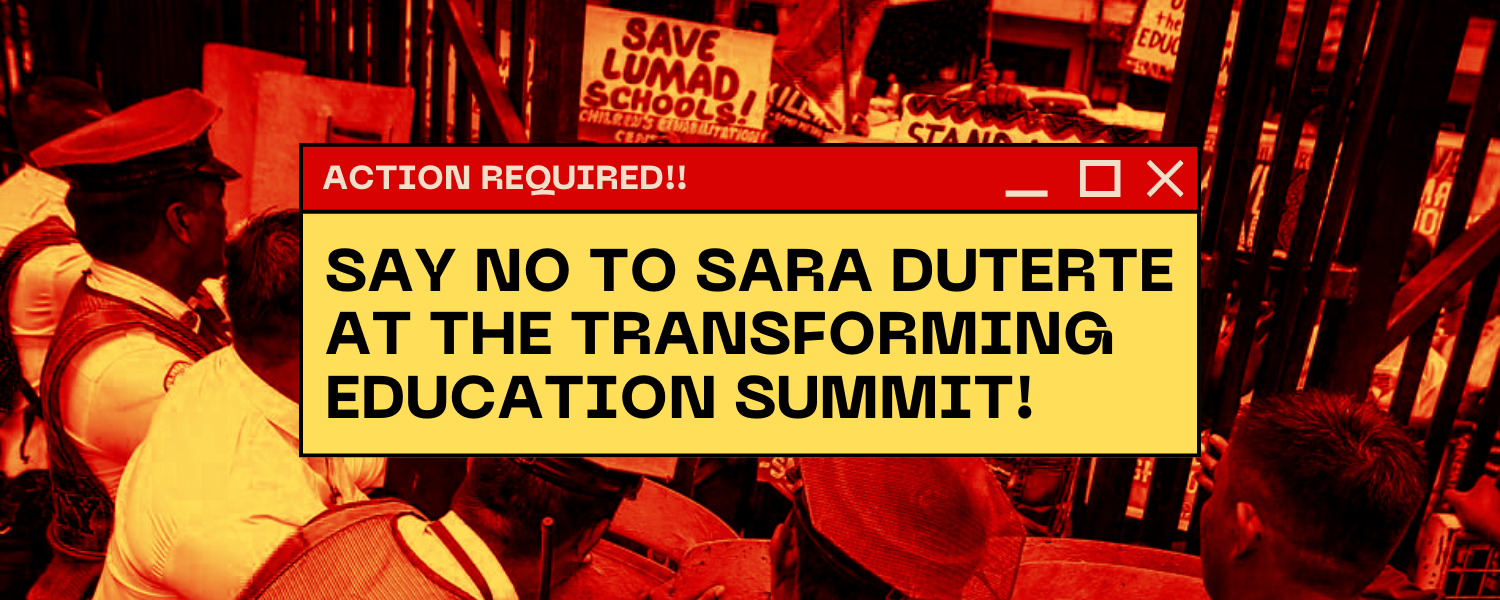 Philippine Vice President and Secretary of Education, Sara Duterte, has been invited by the United Nations to its Transforming Education Summit this September 16, 17, and 19 in New York. We view this as an insult to Filipino youth and other learners, who have been under direct attack by Sara Duterte, her father, and the administration she represents. Rather than being a champion to transform education, Duterte has forcibly closed down Indigenous Lumad schools, labeled youth and educations rights activists as terrorists, and prioritizes the militarization of youth and education.
