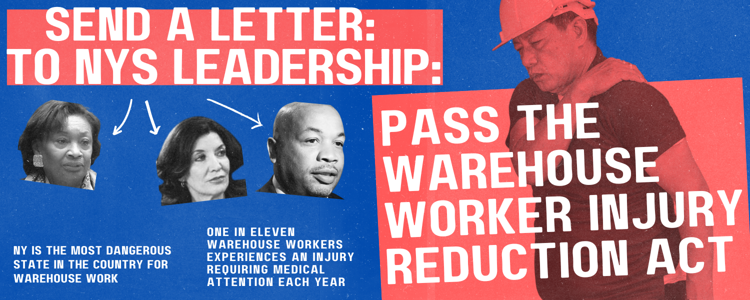New York is the most dangerous state to be a warehouse worker, with an injury rate 54% higher than the national average.. One in 11 New York State warehouse workers experiences an injury requiring medical attention each year. Despite this crisis, the recently released one-house budget proposals do not include the Warehouse Worker Injury Reduction Act (WWIRA), a bill we have been fighting for more than a year. We need to send a clear message to Governor Hochul, Speaker Carl Heastie, and Majority Leader Andrea Stewart-Cousins: End New York State’s warehouse worker injury crisis.