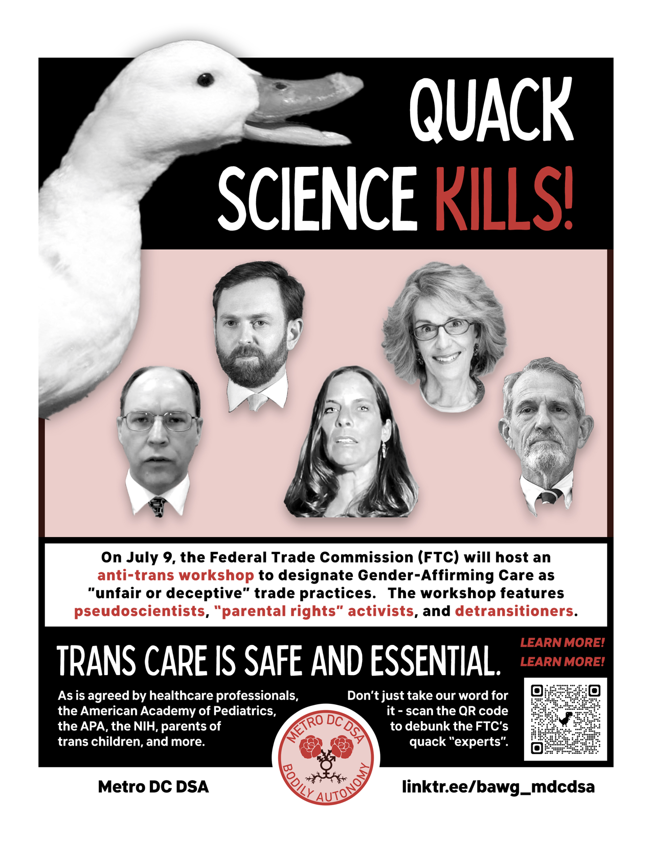 Denying GAC to transgender youth has devastating, well-documented consequences: drastically increased depression, anxiety, suicidality (attempts rise by up to 72% under bans), irreversible physical harm from forced puberty, dangerous unsafe alternatives, and severe financial/geographic burdens on families. Bans also cause systemic healthcare breakdowns through clinic closures, provider flight, harmful overcompliance, child abuse investigations against supportive parents, and erode vital research and advocacy. The Metro DC DSA Bodily Autonomy Working Group condemns these bans as attacks on bodily autonomy and life-saving care, fueled by political ideology, and calls for resistance against efforts like Trump's agenda to restrict transgender healthcare and reproductive rights.